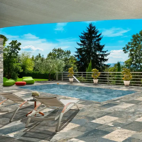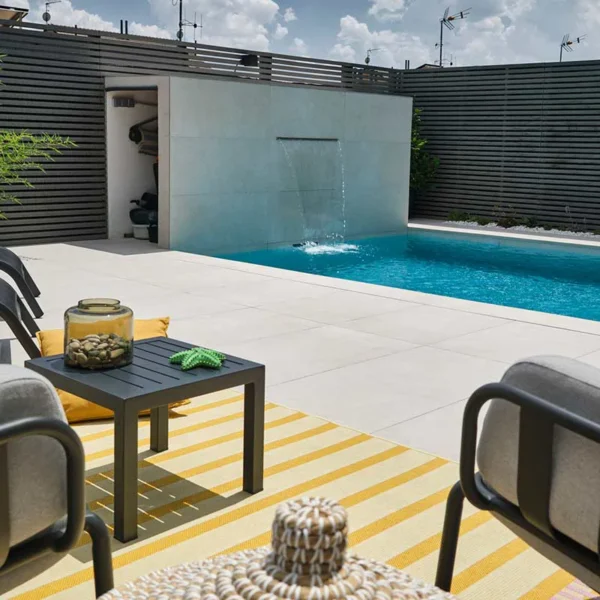 O mesmo se aplica às propriedades antiderrapantes. Ao colocar um azulejo no chão, é recomendável usar azulejos grandes de porcelanato para exterior antiderrapantes. O azulejo deve ser classificado como R10 ou superior, mas quando se trata de áreas suscetíveis, como a borda da piscina, recomendamos sempre usar um R11. Esta informação pode ser encontrada na página de todos os nossos produtos.
